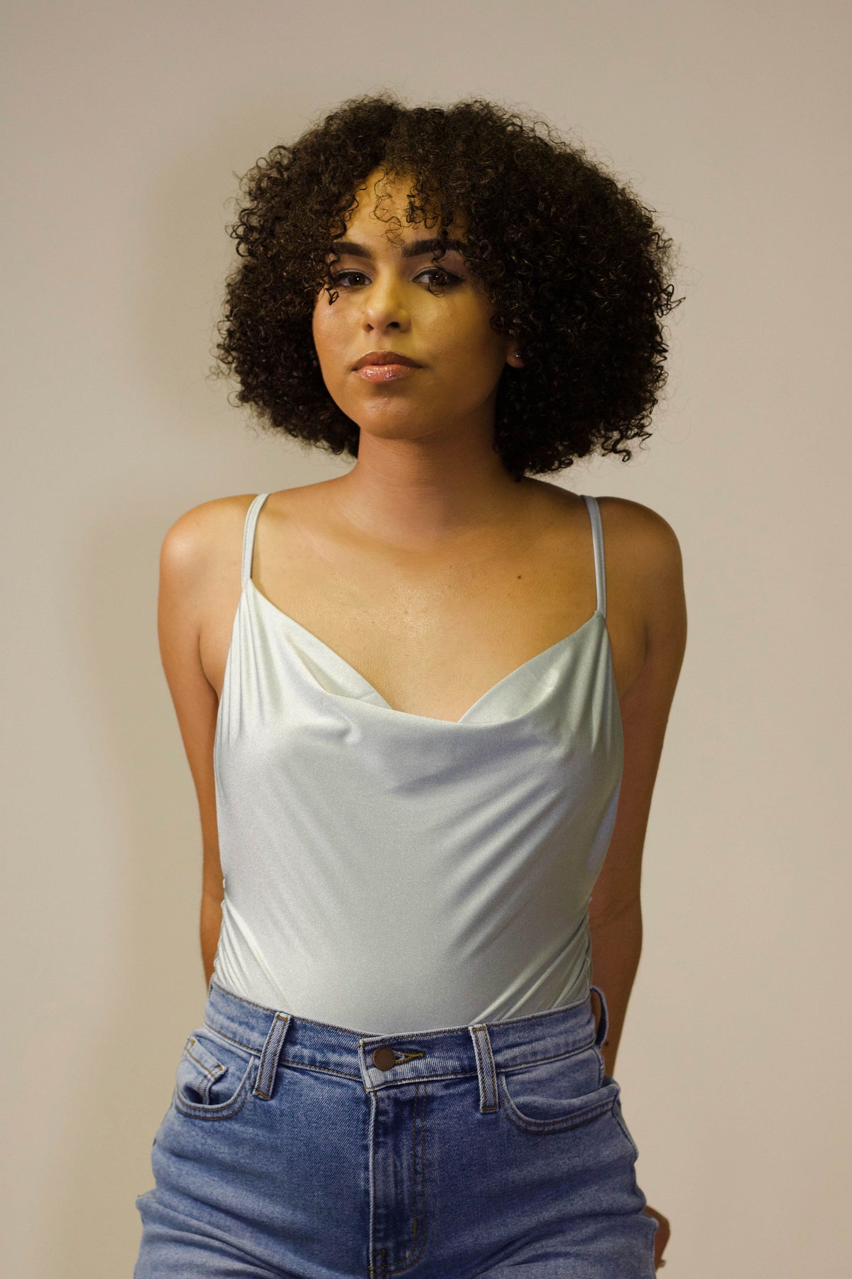Slinky, satin, cowl-neck bodysuit in MINT.