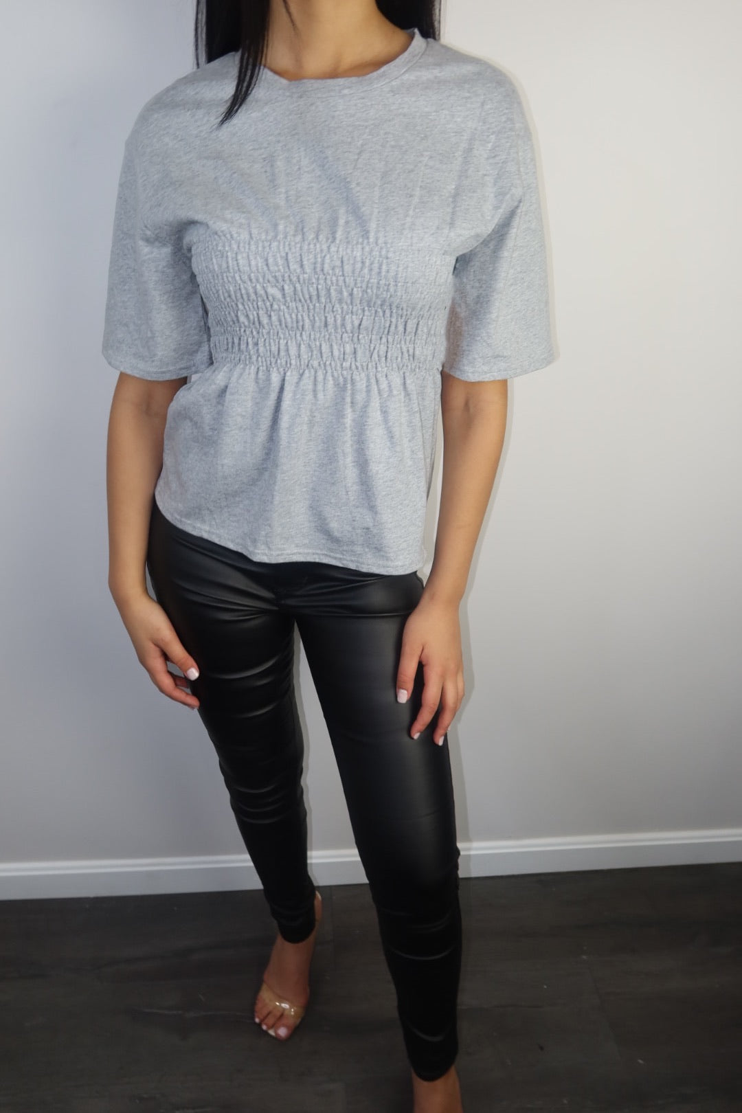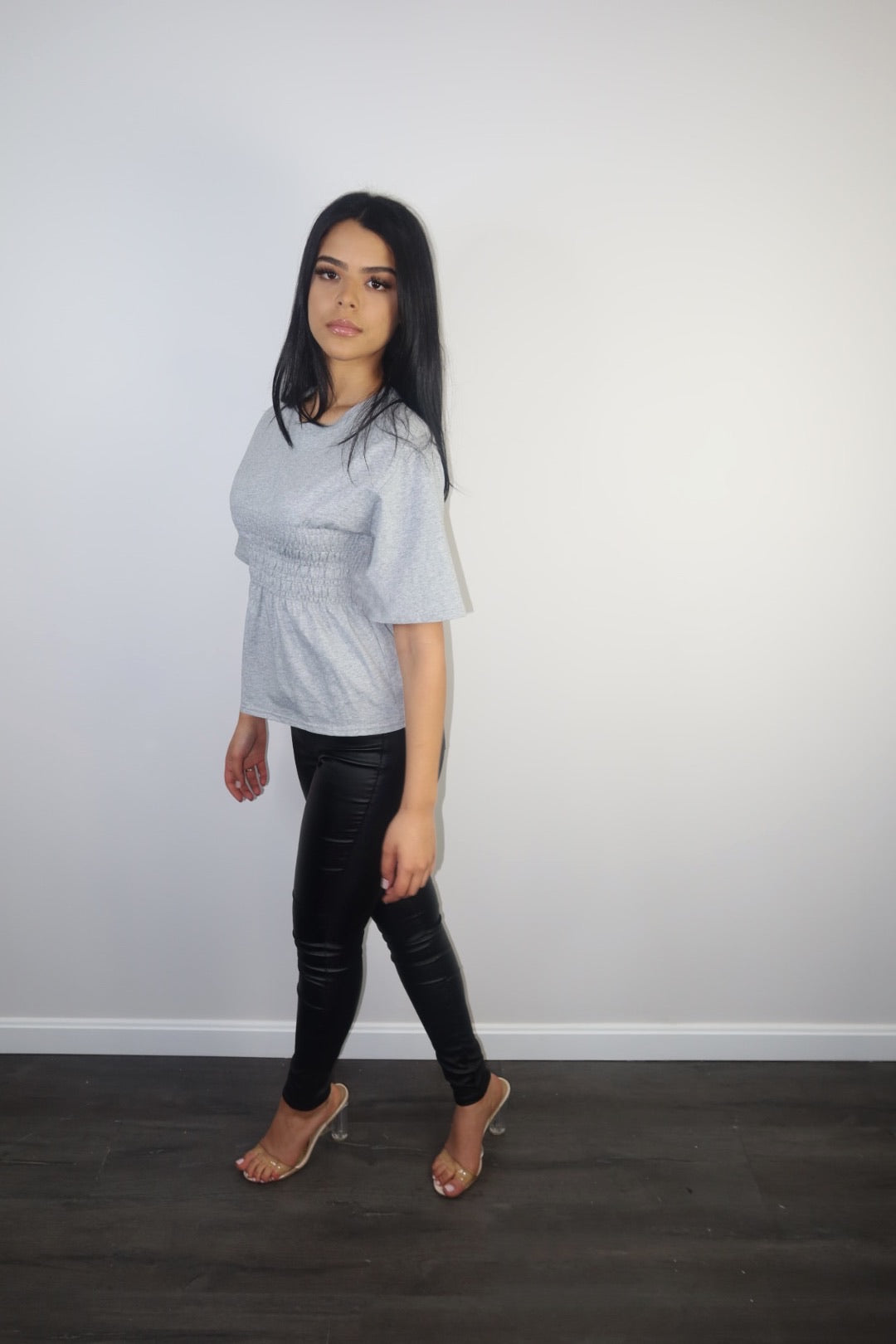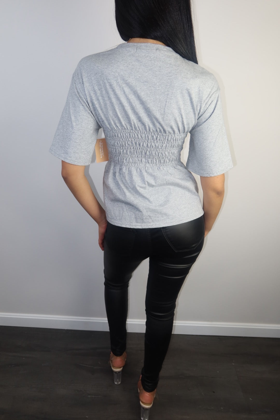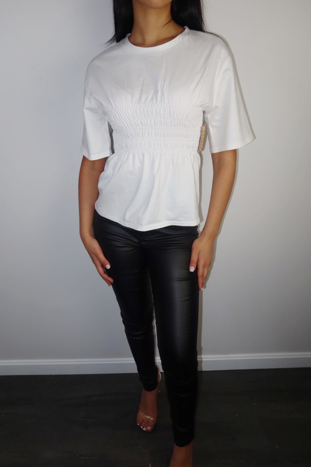 Essential t-shirt in your closet but with spice. Ruched waist for a babydoll shirt effect.