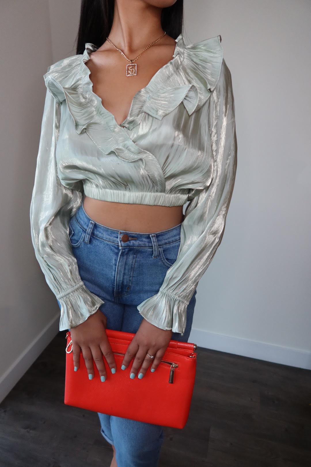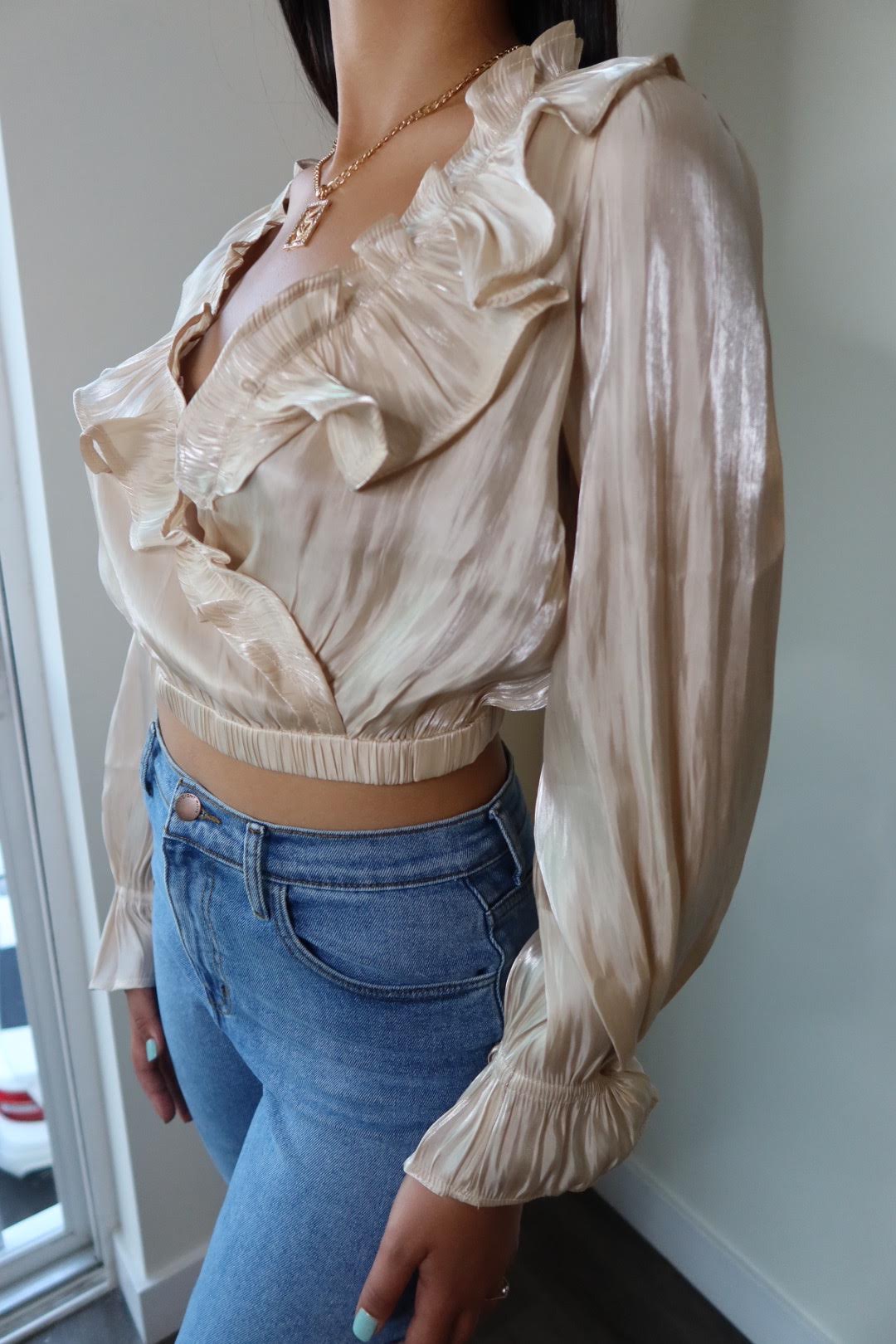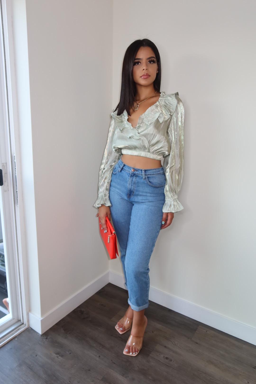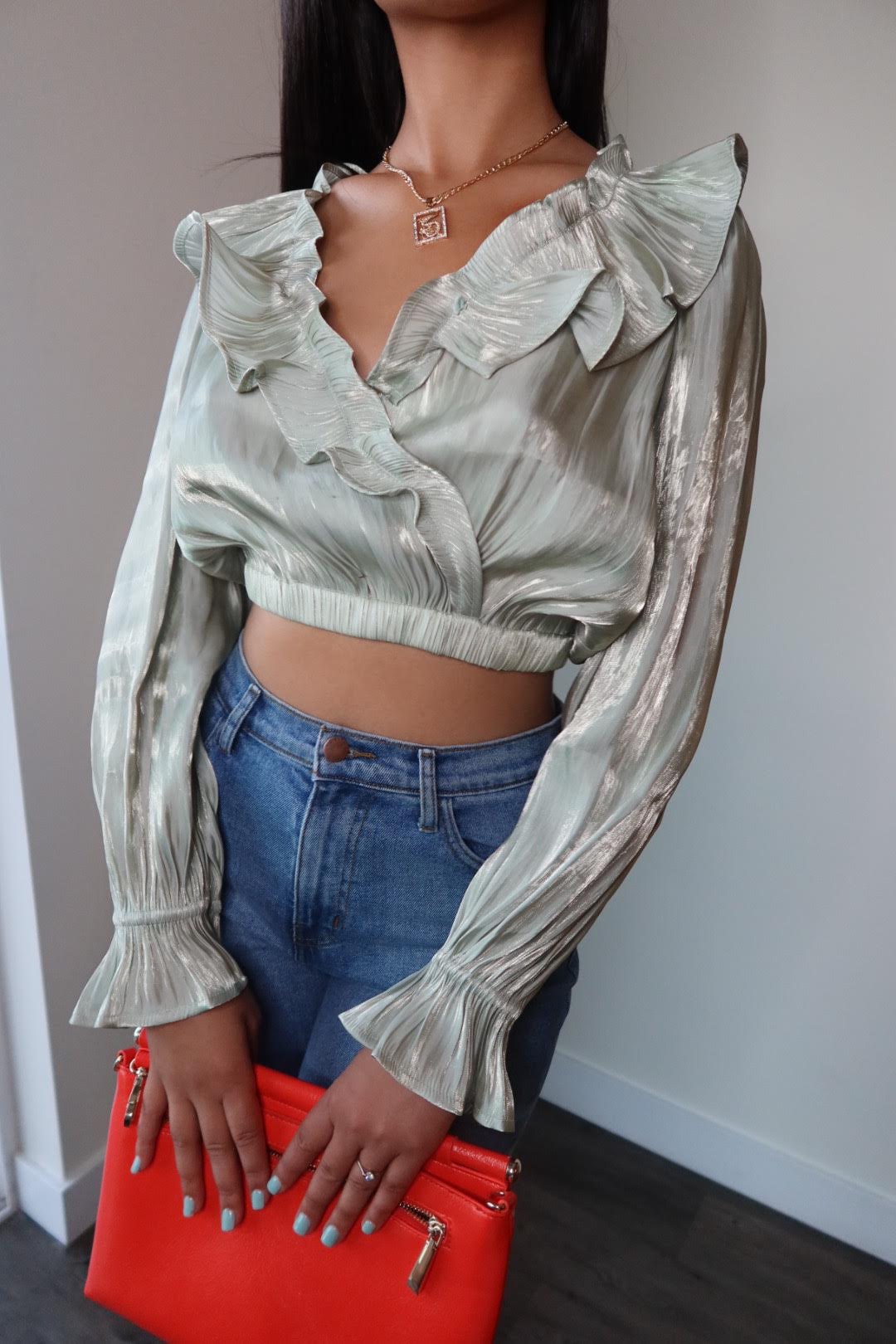 Long sleeve, shiny cropped blouse with ruffle detailing alongside the front. Pair with heels or booties for the perfect Brunch look! Available in Ivory and Sage.