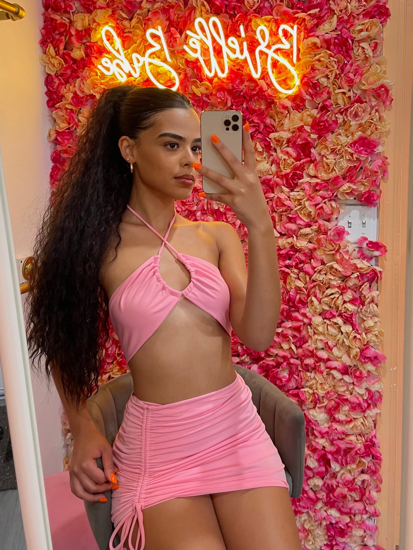 Bandeau scrunch set with adjustable strings for length. Top can be worn multiple ways!
