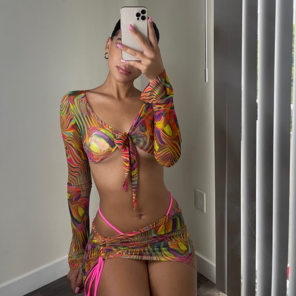 Three piece swirl print mesh set. Completely see through, comes with matching thong underwear.