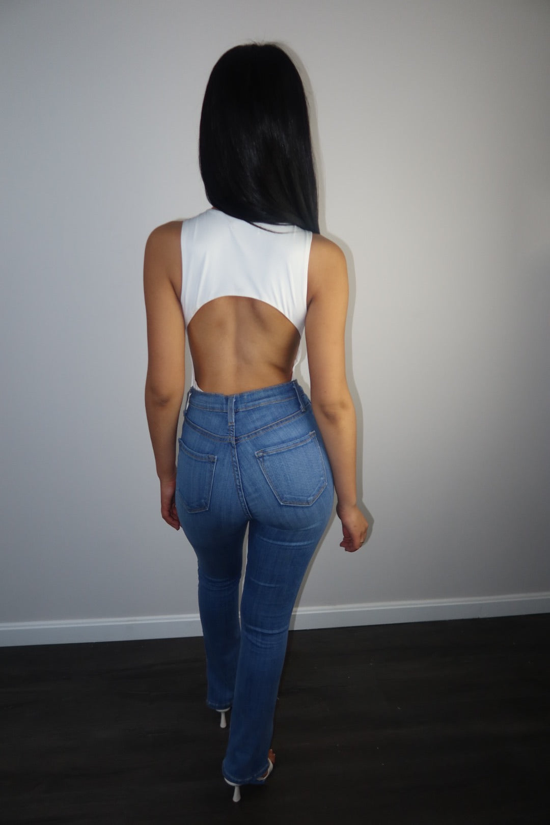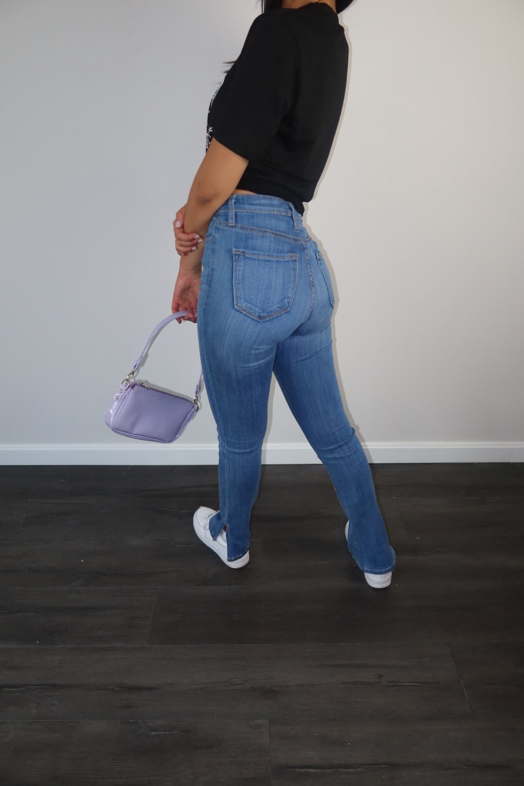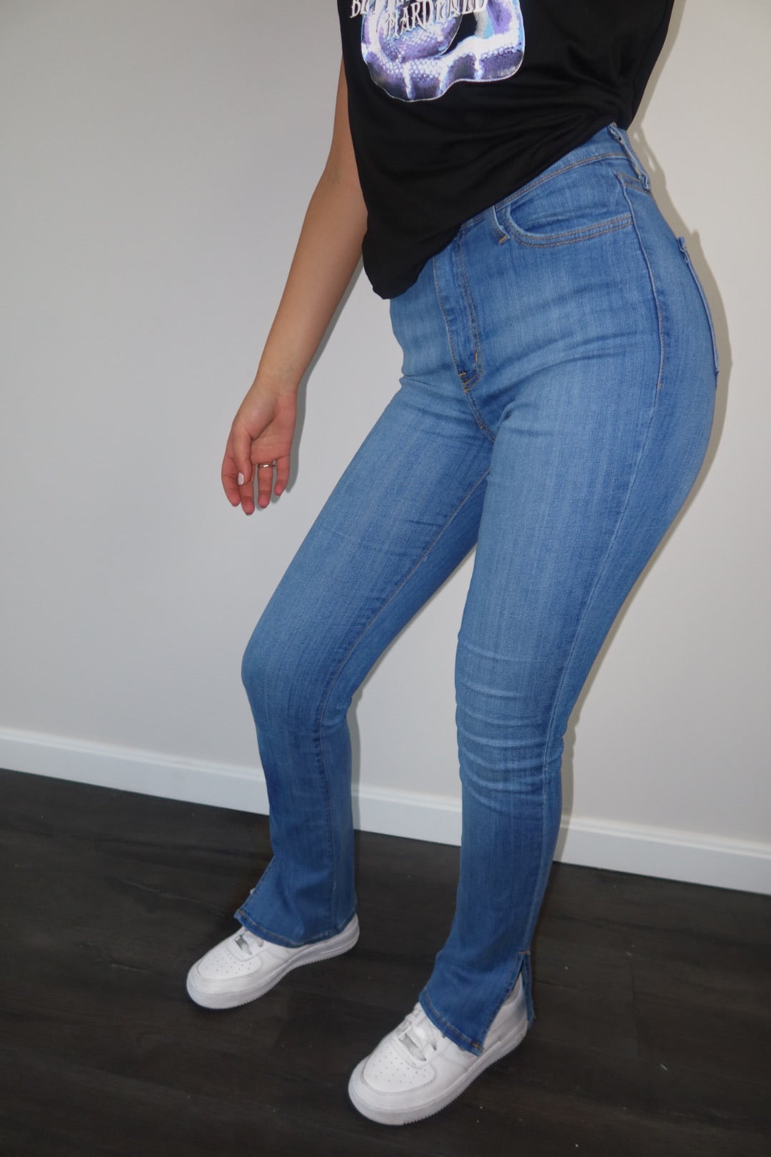 High waisted, stretchy, split- hem jeans. Medium to light wash.