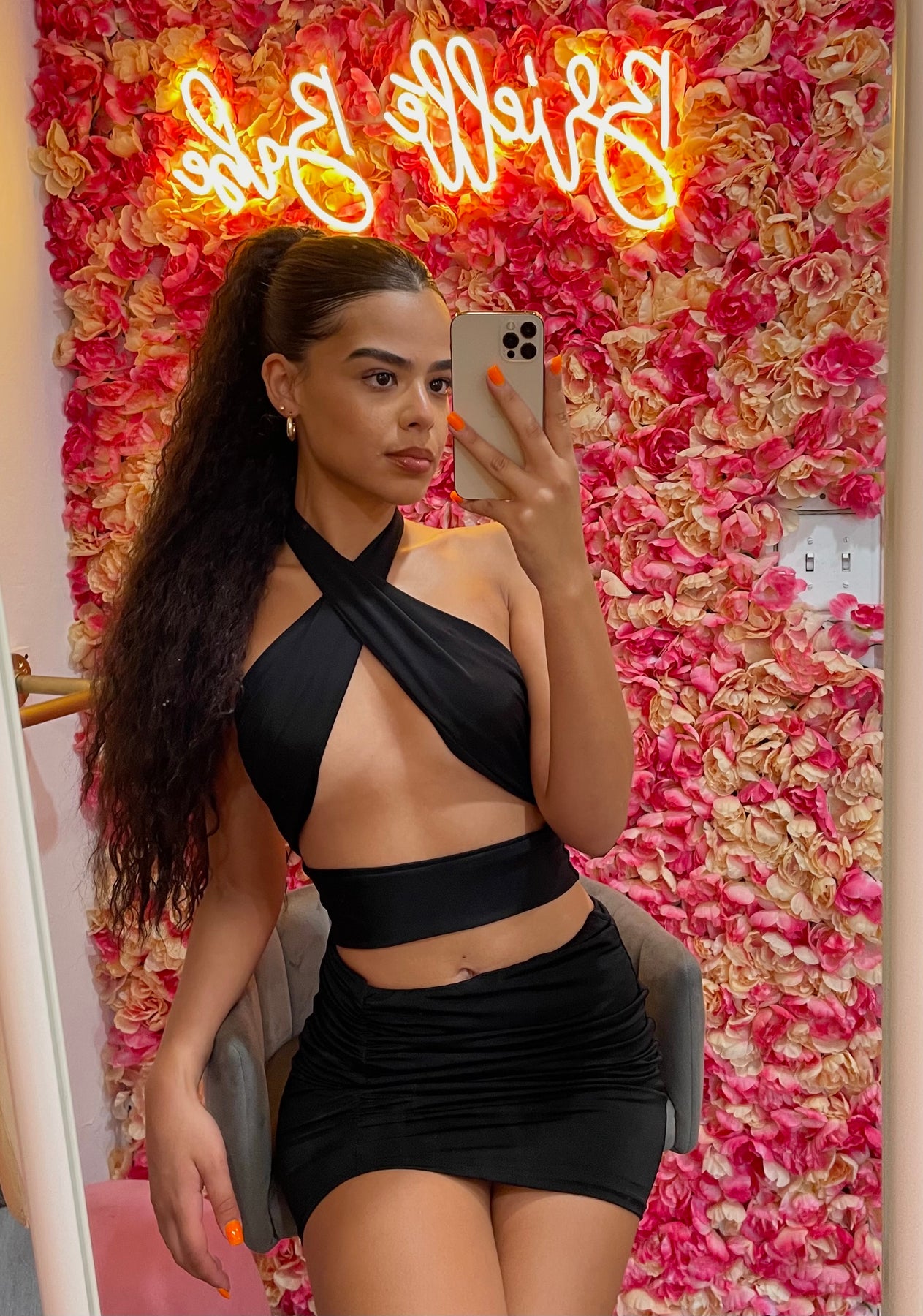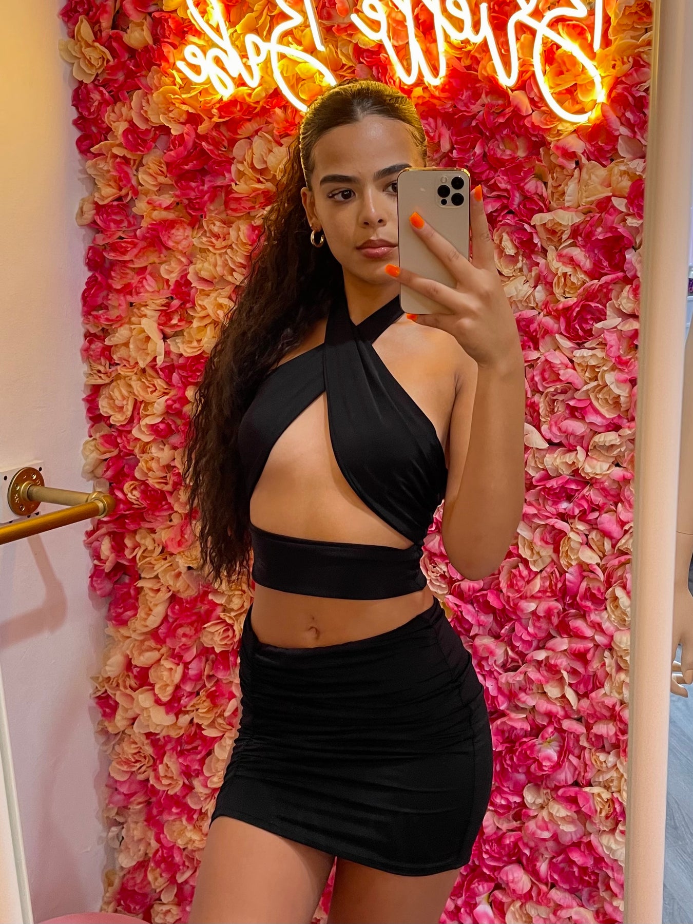 Crop top and mini skirt set with halter neck and open bust. Skirt includes a ruched side detail.